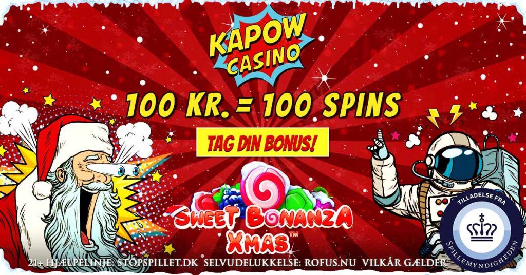 I anledning af julen skifter Kapow i dag, den 24. november 2025, velkomstbonus, så de nu giver 100 spins for en indbetaling på 100 kr.